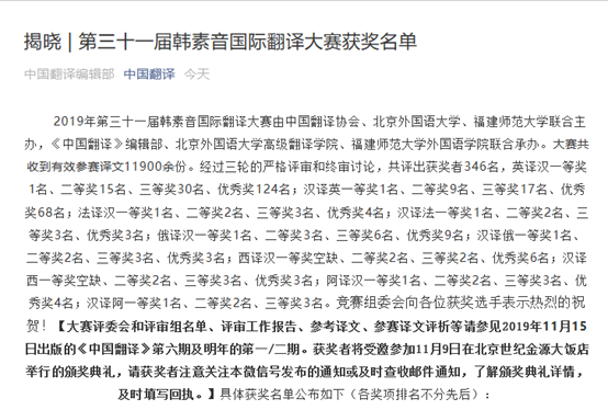 2019年9月25日,由中国翻译协会、北京外国语大学、福建师范大学联合主办,《中国翻译》编辑部、北京外国语大学高级翻译公司、福建师范大学bevitor伟德联合承办的第三十一届韩素音国际翻译大赛获奖名单揭晓。本竞赛分别设立汉语与英语、法语、俄语、西班牙语、阿拉伯语五个语种双向互译,共计10个比赛项目。大赛共收到有效参赛译文11900余份,共评出获奖者346名。