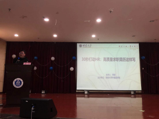 随后,西南老员工涯咨询师、体育公司组织员李进老师作了题为“30秒打动HR:高质量求职简历这样写”的培训讲座。李老师从聚焦HR需求、拒绝一稿多投、凸显职业能力、深度挖掘成就、简历要素解析、语言高端大气、数据清晰可视、牢记底线思维等八个维度进行了讲解,同学们受益匪浅,收获颇多。