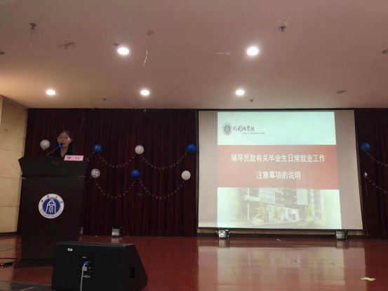接着,2016级本科生辅导员曹灿老师就毕业生日常就业工作注意事项作了说明。曹老师提到:信息是最重要的。同学们务必随时关注就业信息、平台、事务群官方消息,各种本生源地群消息。曹老师强调了三方材料、就业推荐表以及其他就业相关材料的发放问题,还说明了各类材料的填写要求。曹老师提出,同学们在每一次的面试过程中都能发现自身存在的问题,我们要带着这些问题,在下一次的面试中加以改正、扬长避短,把每一次的尝试当作一次学习,越挫越勇。