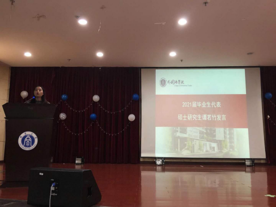 接着,2021届毕业生代表硕士研究生谭若竹同学发言。谭若竹从个人的学习经历出发,分享了自己自本科时期便坚定想当一名人民教师的职业梦想,同时感谢了公司老师及导师杨晓钰老师的谆谆教诲。谭若竹同学以两次成功的应聘经历为例,提出应聘教师首先要做到的便是角色的转变,其次是教态和口语的表达。同时她分享到,多次的失败亦是成功的基石,希望每位同学能够总结经验、保持自信,最终找到理想的工作。