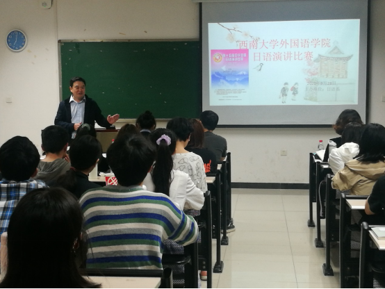 比赛结束后,日语系主任彭玉全老师对此次演讲比赛进行了点评。他首先肯定了各位参赛选手对本次而做出的努力和认真准备,虽然有的同学演讲比赛经验不足,有的同学过分紧张,影响了水平的发挥,但大家的日语表达能力比较好,只要大家努力,一定能取得更大进步。他鼓励大家积极参加“日语角”口语练习