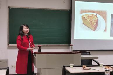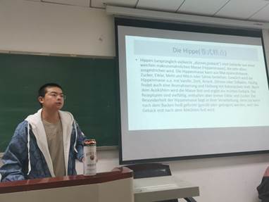 台上,同学们生动的讲述着各类美食的历史背景,传说故事,烹饪方法。台下,同学们配合品尝各类食物,咸水面包、果脯蛋糕、华夫饼、风味烤肠等等。这些极具特色的美食刺激着同学们的味蕾,开启了同学们对德国饮食文化的感性认识。还有同学现场表演讲解德国人倒啤酒的方式与礼节,引起了大家激烈的讨论。期间,冯小俐教授还为同学们补充讲解了关于德国Christstollen(果脯蛋糕)的知识,原来吃起来甜甜的Christstollen是德式传统圣诞节必备水果蛋糕,虽然是德国常见的传统蛋糕,但唯有德累斯顿(Dresden)地区生产的最受德国人喜爱。实际上这些课堂之外的文化细节也是德语系员工们的必备技能。