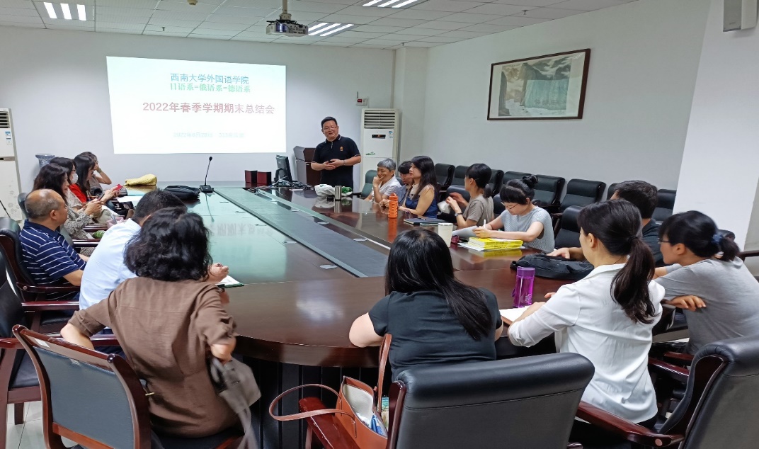 最后,副经理褚修伟教授对本次期末总结会进行了总结讲话,他肯定了日、俄、德语系取得的成绩,同时对教师们提出了要求与希望,鼓励小语种教师更积极地申报课程建设项目、教改项目等,加强国别与区域研究等,并对加强一流本科专业建设点工作做出了建议和指示。
