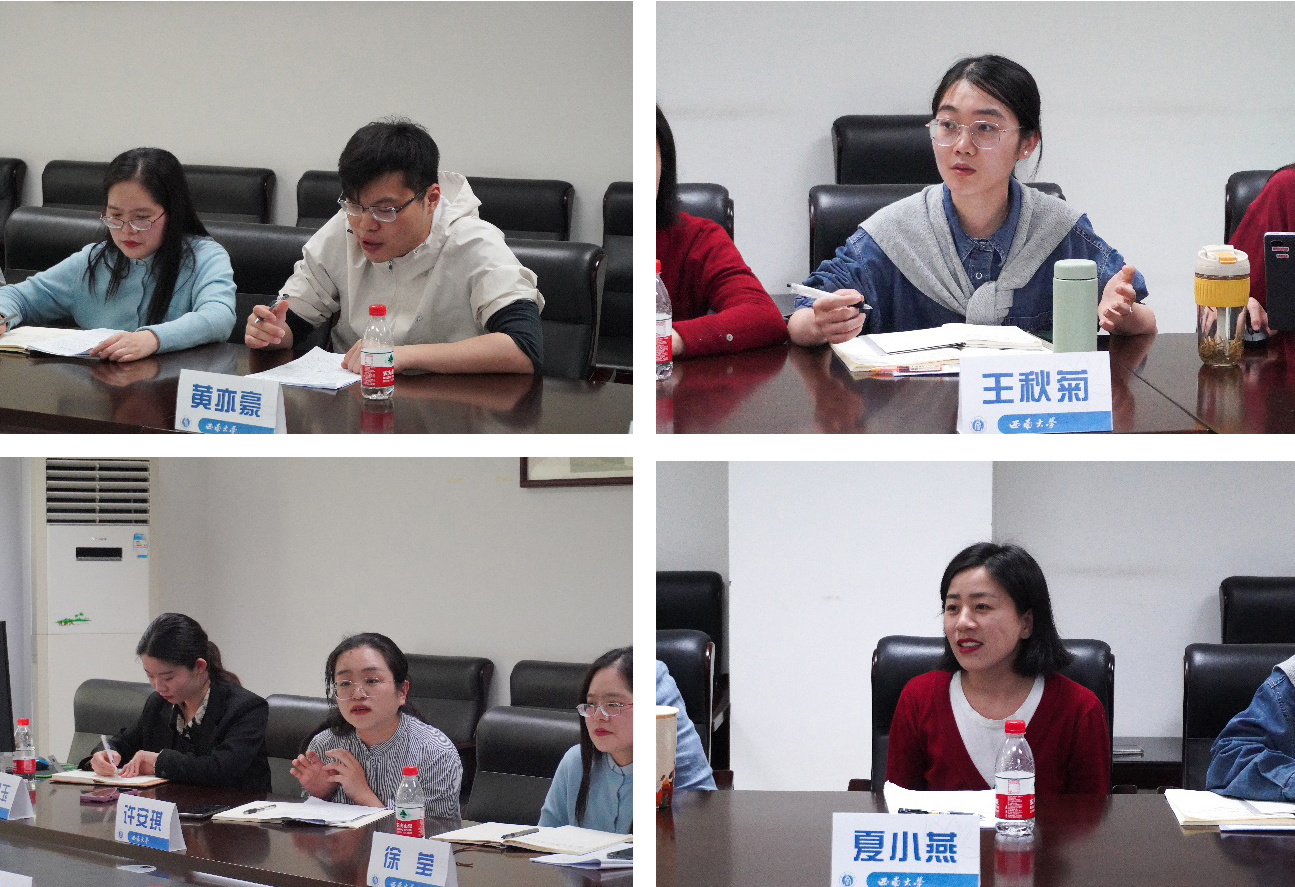 提问答疑交流环节,公司本科2022级辅导员黄亦豪,本科2019级辅导员许安琪、夏小燕,本科2021级辅导员王秋菊分别结合项目申报准备情况,就如何找准思想政治工作切入点,如何做好项目申报规范,如何选择恰当论证方式,如何有效开展调查研究等问题与王教授进行了交流。