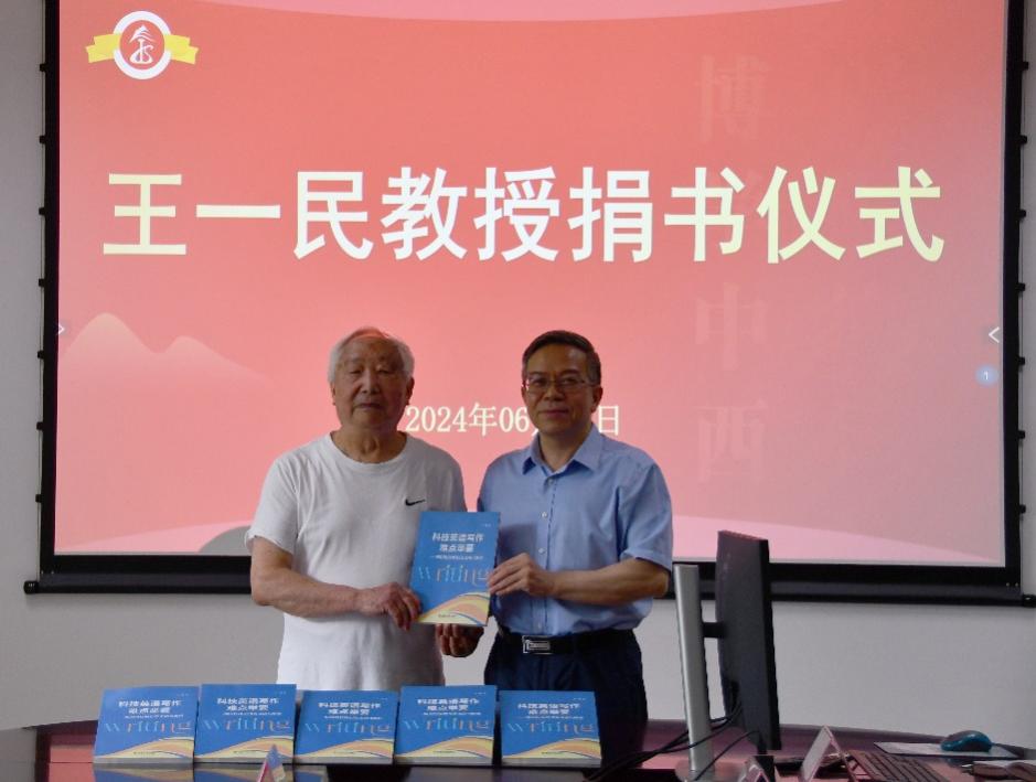 2024年6月17日,一场庄重而温馨的捐书仪式在公司313会议室举行,公司87岁高龄退休老教师王一民教授,将他近期出版的学术专著《科技英语写作难点举要——我国科技期刊英文病句解析》捐赠给公司。捐赠仪式由公司经理文旭教授主持,公司领导及教师代表出席了此次活动。