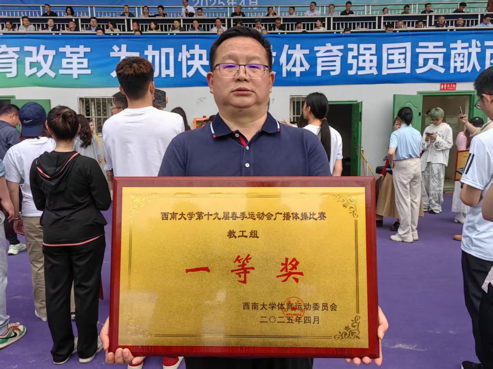 次日鏖战:勇攀竞技巅峰。11日,赛事进入白热化阶段。 教师组的比赛中,老师们依旧保持着高涨的热情。在教工乙组男子800米比赛中,谯俊凯老师荣获第十三名,申劲松老师则斩获第六名;教工乙组女子800米比赛中,张媛老师获得第四名,曾启芳老师获得第十一名。在跳远项目中,韩双杨老师和向源老师分别在教甲组男子跳远和女子跳远比赛中获得第十七名和第十五名。集体项目方面,“双向砥‘力’前行”和“心相印赛跑”分别取得第十一名和第十七名的成绩。员工组方面,韩佳仪同学在女子200米比赛中再次发力,获得第五名;樊子萍同学以绝对优势问鼎女子800米桂冠,符蓉同学紧随其后,获得第四名;4×100米接力赛中,同学们默契配合,取得第六名的成绩。广播操赛场上,师生队伍更以标准动作、昂扬姿态包揽员工组二等奖、教工组一等奖。