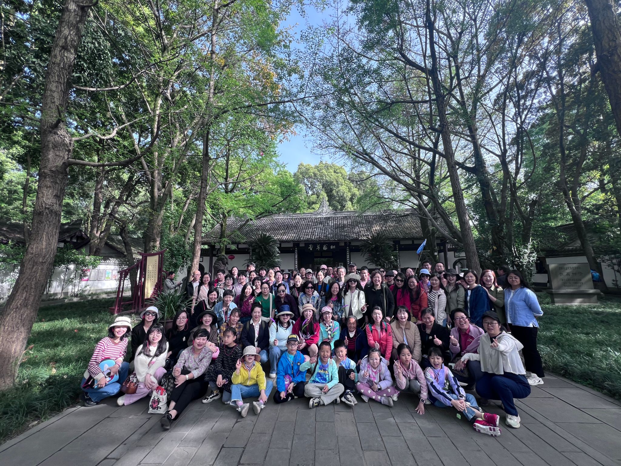 次日,众人来到成都杜甫草堂。一进入草堂,浓郁的文化气息便扑面而来。沿着蜿蜒的小径,大家先后参观了杜甫草堂旧址、工部祠、少陵草堂碑亭等景点。春日的草堂,草木葱茏,繁花似锦,亭台楼阁错落有致,与诗人的千古名句相得益彰。教职工们漫步其中,仿佛穿越时空,与杜甫进行了一场跨越千年的对话,感受着诗人的家国情怀和文学魅力。家属们在这如画的景致中沉浸于春日的温馨,孩子们在绿茵上欢腾奔跑,银铃般的笑声在草堂上空久久回荡。