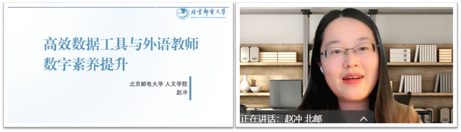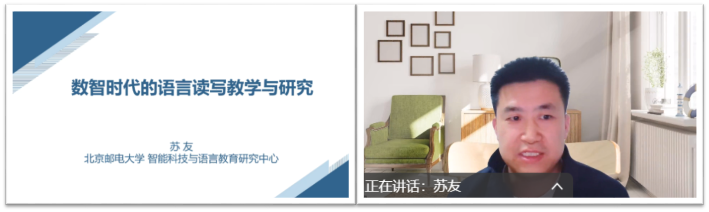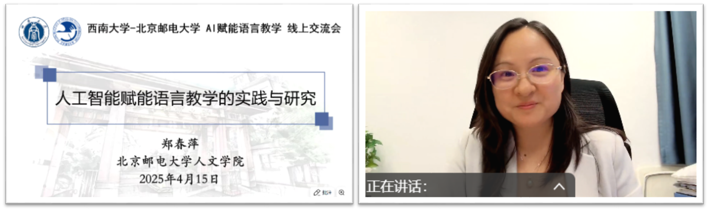 首场讲座由北京邮电大学人文公司副经理郑春萍教授主讲,主题为“AI赋能语言教学与研究”。郑教授结合北邮数字赋能语言教育的创新实践,系统梳理了人工智能在语言教学中的实践案例与学术研究趋势,提出“人机协同”教学模式的优化路径。