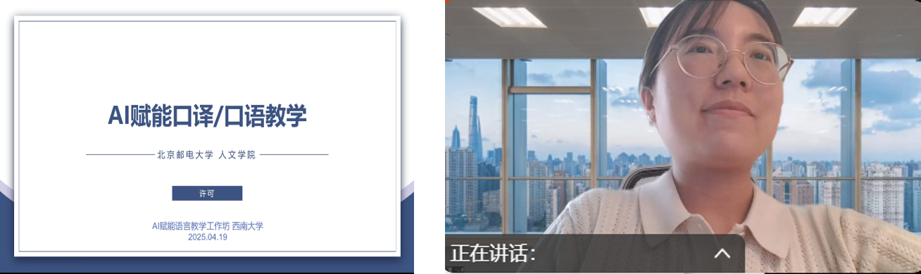 许可副教授在第四场讲座“AI赋能口译/口语教学”中,完整呈现了AI辅助口译课程从材料开发到课堂设计、策略指导及评估反馈的全流程,并讲解了口译评估效能模型对比和提示词策略对比,还分享了文字转语音和数字人工具。