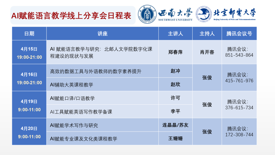 自2024年公司印发《BEVITOR伟德全面推进本科课程教学数字化建设实施办法 (试行)》(西校〔2024〕198号)以来,公司积极谋划,持续推动课程教学数字化建设。为加速提质课程教学数字化转型,强力支持大学外语综合改革,公司4月15日至20日通过腾讯会议平台,特邀北京邮电大学人文公司数字课程建设团队,面向全院教师开展“人工智能赋能语言教学”系列线上分享会。