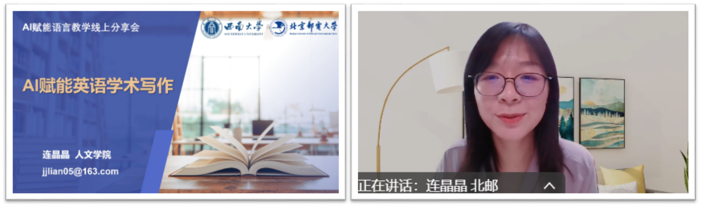 连晶晶副教授与苏友副教授共同主讲了第六场讲座“AI赋能学术写作与研究”,前者聚焦大语言模型在教学活动设计中的应用,后者结合团队科研成果,分享了AI赋能语言读写教学的创新实践。