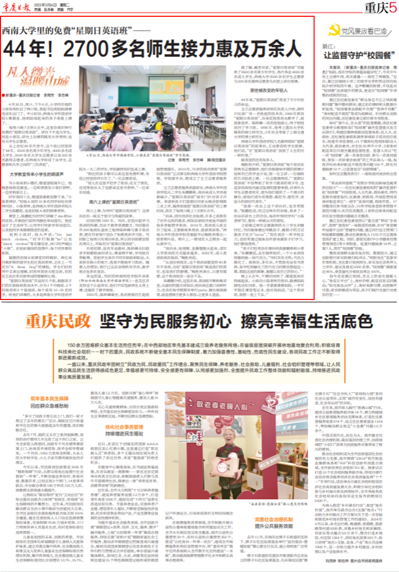 4月30日,重庆日报在《走“青年路”、说“青年话”、有“青年味” 我市高校为青年成长成才建功立业厚植沃土》的专题报道里,特意提及了“星期日英语班”,从侧面凸显了该班在高校服务社会、助力青年成长方面所发挥的重要作用。