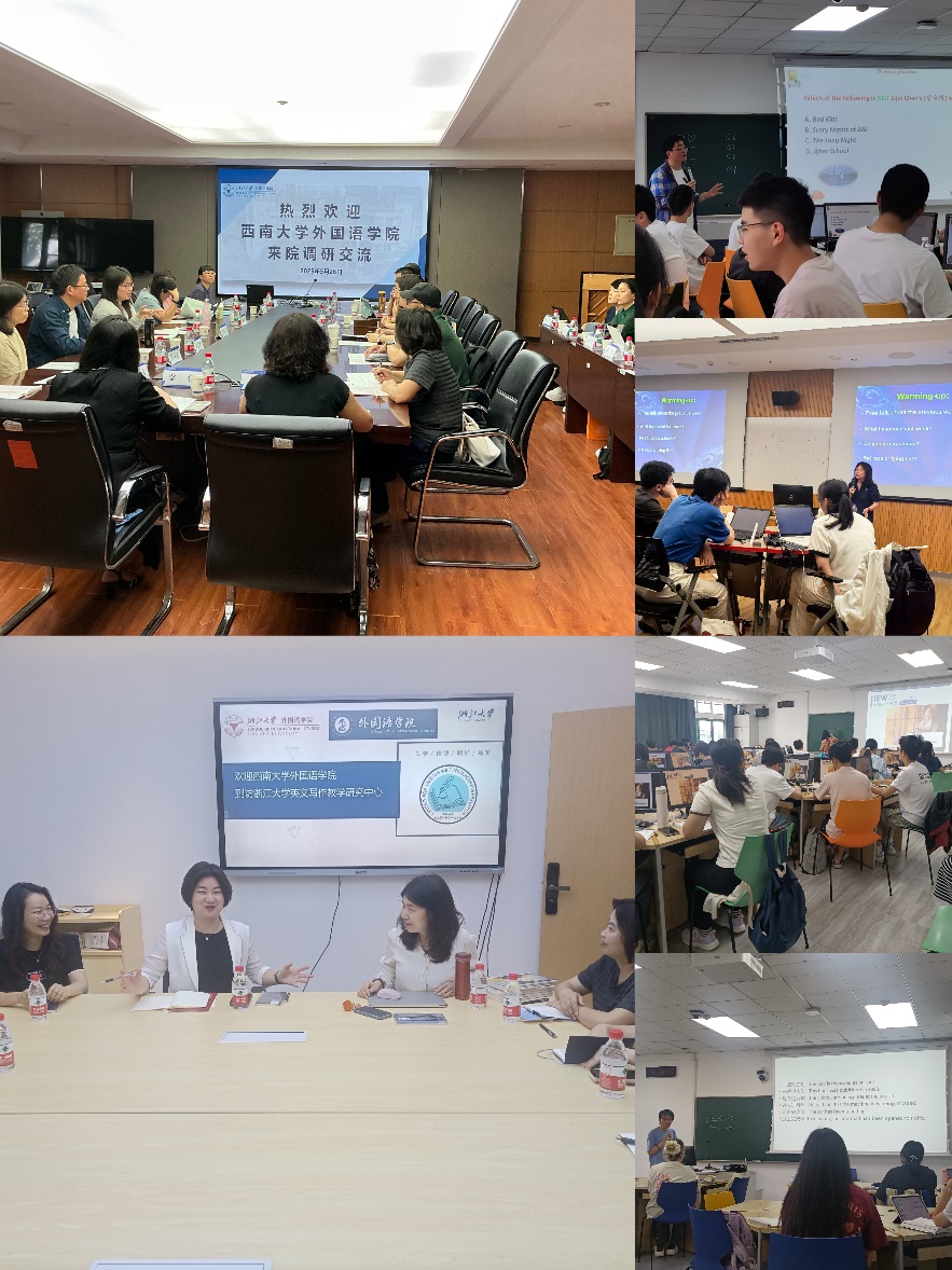 交流会上,浙江大学公司领导围绕大学外语教育,从课程体系搭建、教学模式创新、数字化资源平台建设、课程评价体系完善,到竞赛实践活动的组织等多个维度,进行了细致入微的经验分享。同时,还着重介绍了“大学英语虚拟教研室”和“理解当代中国虚拟教研室”的建设成果,以及将“理解当代中国”课程融入日常教学、推动“四新”外语教育的具体实践案例。这些宝贵的经验为公司教师提供了全新的思路和方向。会后,公司一行参观了浙江大学英文写作教学研究中心。