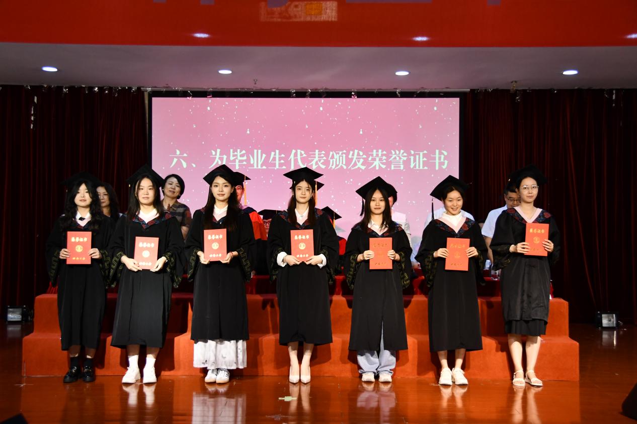 随后,主席台嘉宾依次为毕业生代表颁发荣誉证书、毕业证书,为联络员代表授予聘书。