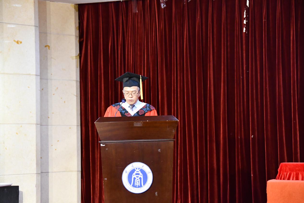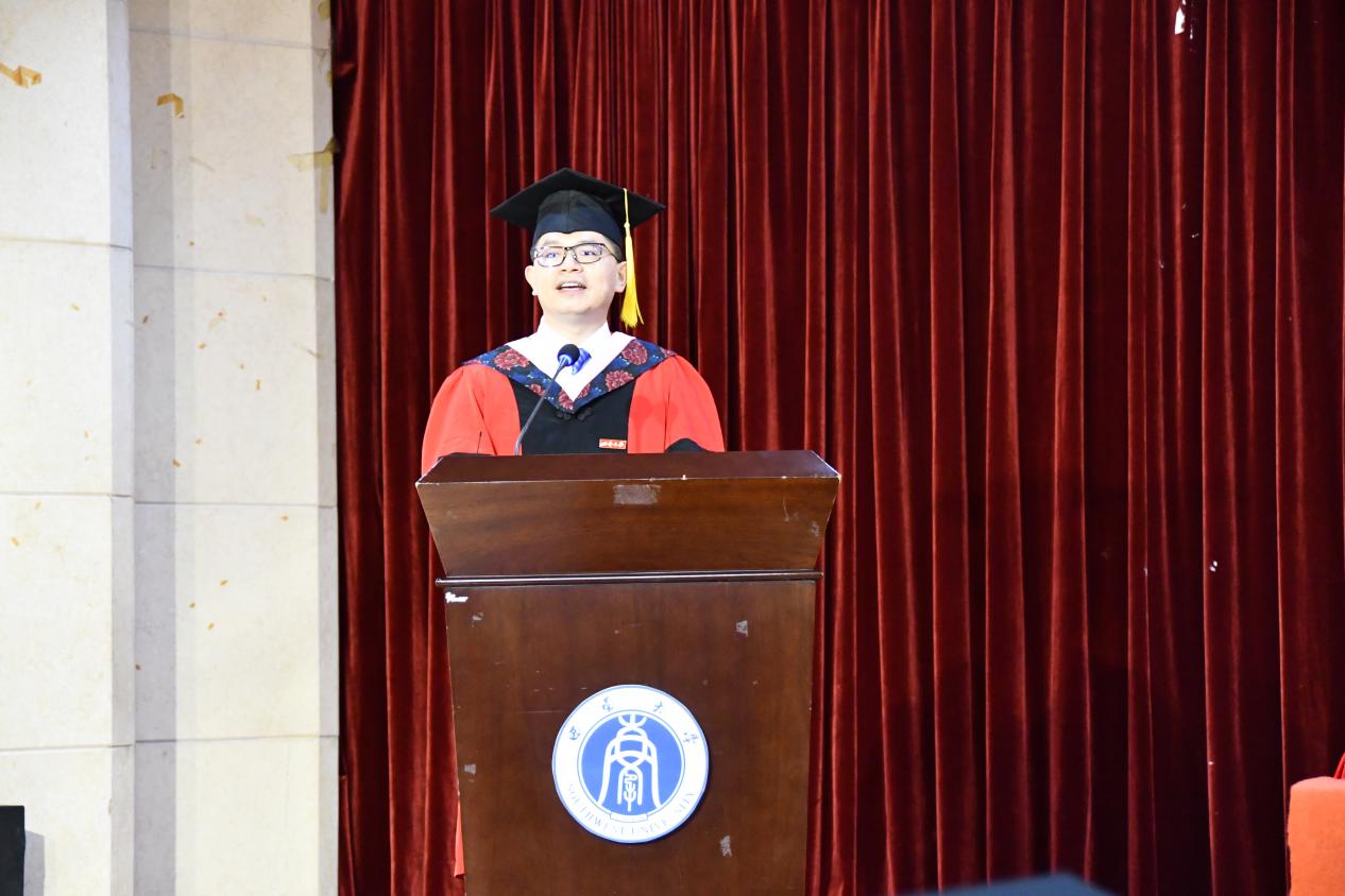 教师代表杨坤教授回顾了与同学们相处的点点滴滴,从课堂上的知识探讨,到校园活动中的欢乐互动,那些共同经历的时光成为了彼此心中最难忘的记忆。他满怀期望地希望同学们毕业后能铭记作为外院人的初心与使命,无论未来从事何种职业,都能永葆热情,以所学所长勇敢迎接挑战,在人生的新征程中坚守信念,砥砺前行。