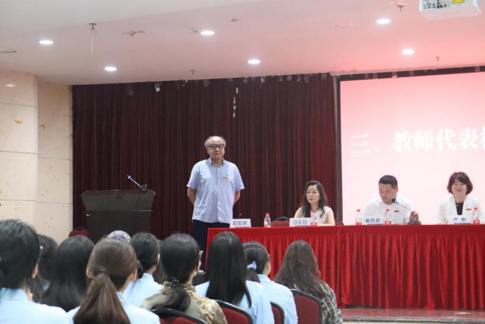 接着,教师代表杜世洪教授结合自身外语学习与教学研究的经历进行发言,寄语新生要牢记“博学中西,砥砺德行”的院训。他鼓励同学们既要扎根中国大地,也要具备全球视野,做一名博雅、务实、有为、有梦的人。