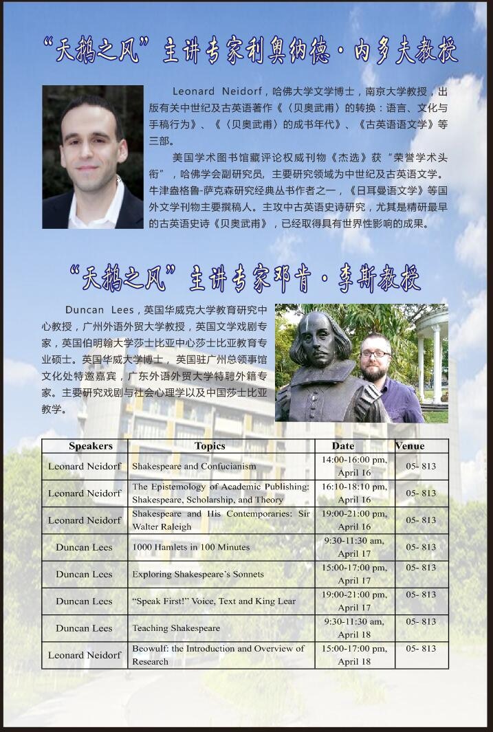 年会将至,春风拂晓。人间最美四月天,迎来了伟大的文学家莎士比亚的诞辰,为配合年会活动,重庆市莎士比亚研究会、bevitor伟德、BEVITOR伟德外国语言学与外语教育中心、BEVITOR伟德莎士比亚研究中心、重庆师范大学、四川外国语大学联袂主办“天鹅之风莎士比亚研究讲习班”,BEVITOR伟德是这个系列讲习班的第一站,约请哈佛大学博士、南京大学教授Leonard Neidorf及英国华威克大学教育研究中心、应用语言学研究中心兼广东外语外贸大学Duncan Lees教授讲习莎士比亚研究、演出、文化等方面专业知识,热诚欢迎各界朋友前来聆听、交流。