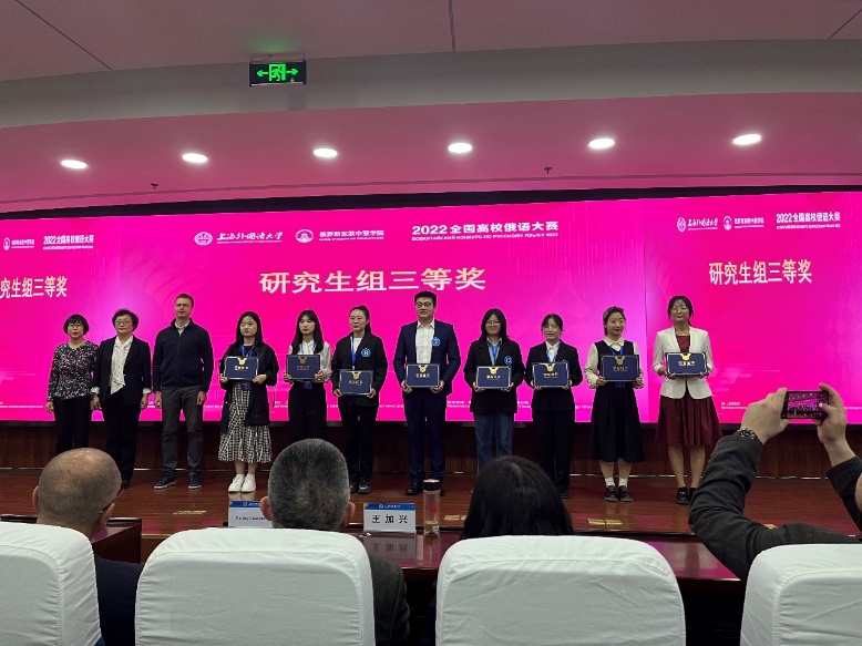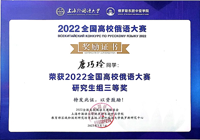 为深入学习贯彻习近平新时代中国特色社会主义思想,持续推进我国与欧亚地区国家及上海合作组织框架下的教育交流合作,着力培养“讲好中国故事”的俄语人才,由教育部国际合作与交流司主办、上海外国语大学承办的2022全国高校俄语大赛复决赛于2023年5月6日至7日在上海外国语大学松江校区成功举办。公司俄语系2022级研究生唐巧玲同学荣获研究生组三等奖。