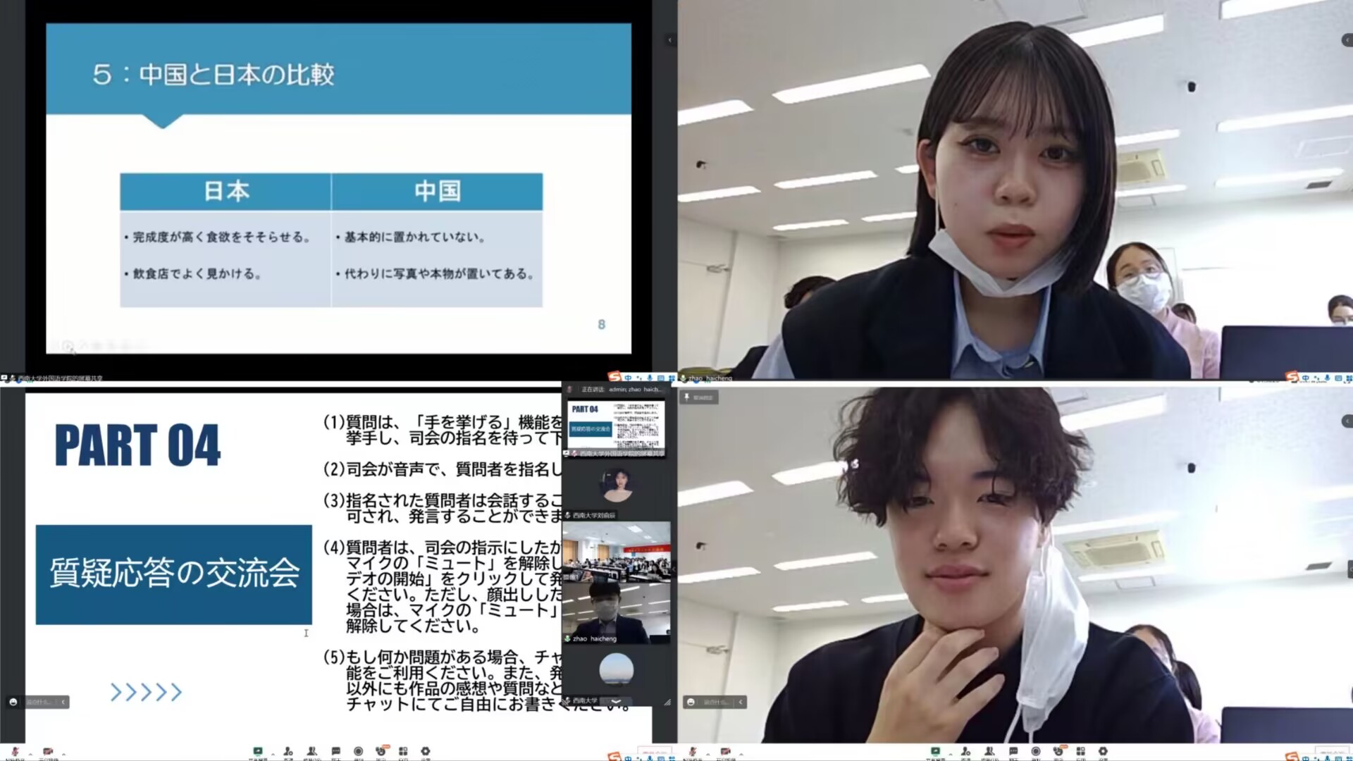 在视频作品展示环节,来自明星大学的员工们以生动活泼的语言介绍了“日本无障碍设施”,“日本食品模型技术”等内容;公司员工也带来了主题丰富的作品,他们采用短视频加日文配音的方式展示了各自家乡的民俗风情和风味小吃,向日方老员工展示了中国之美景和美食。中日老员工短视频作品展示环节极大地促进了两国员工的交流和理解,进一步加深了中日老员工间的友谊。
