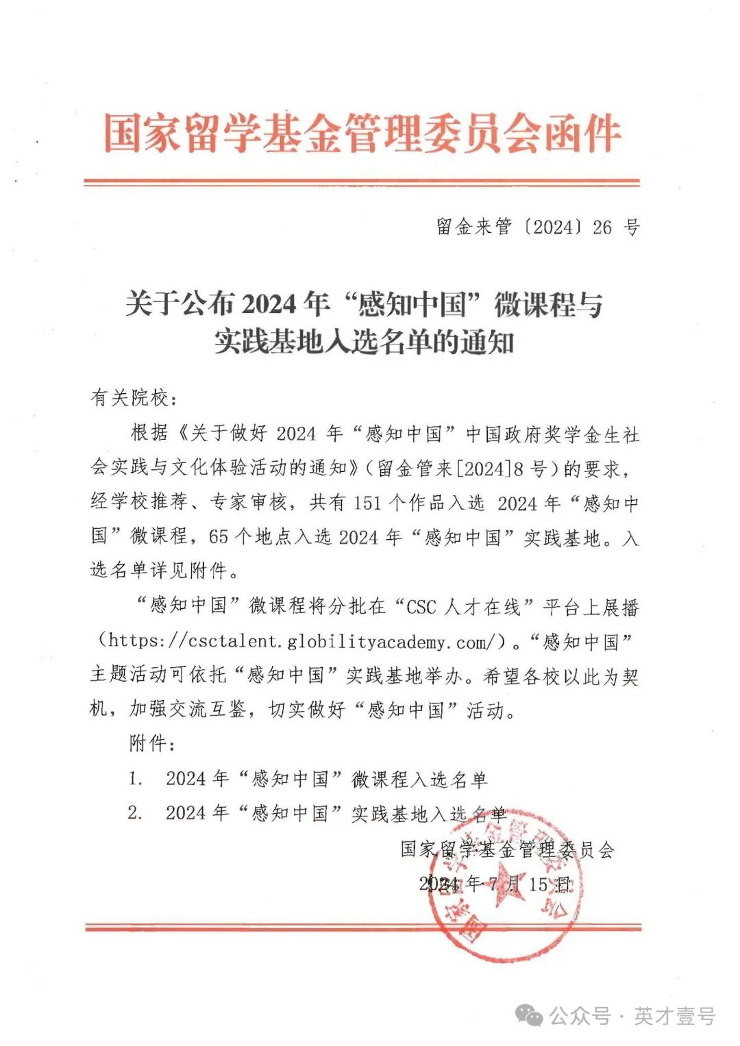 据悉,“感知中国”微课程是国家留学基金委为贯彻落实党的二十大精神和习近平总书记给在华职工多次回信精神,于近年组织的“感知中国”中国政府奖学金生社会实践与文化体验活动的一部分。留学基金委面向全国征集“感知中国”微课程,建设课程库和讲师团,为各校来华留学国情教育提供可借鉴的课程范例。入库作品将在“CSC人才在线”培训平台展播,入库教师将纳入“感知中国”讲师团。