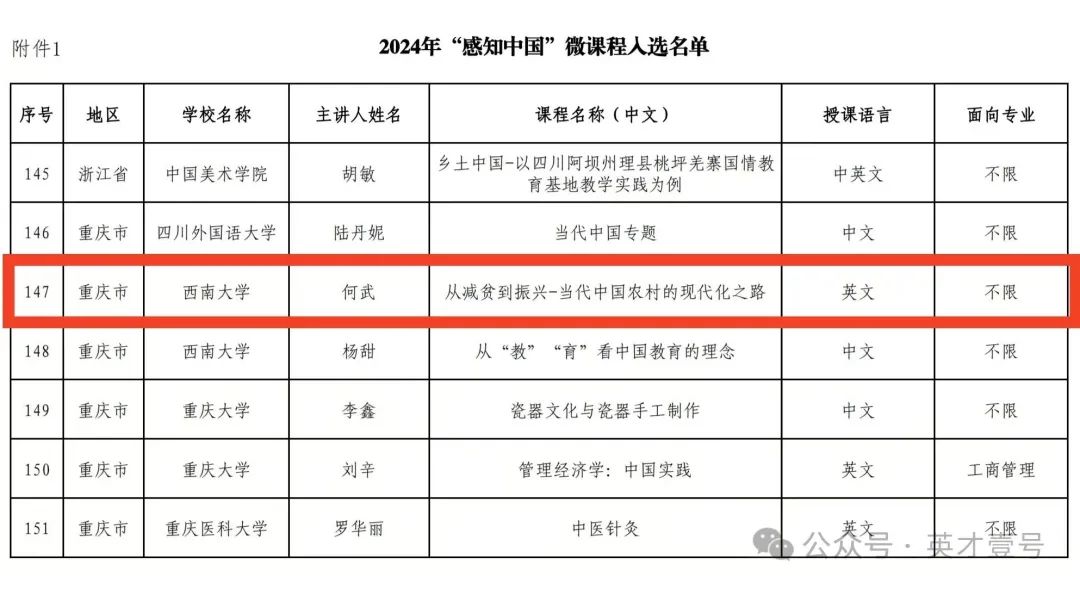 近日,国家留学基金管理委员会公布了2024年“感知中国”微课程与实践基地入选名单。经公司推荐、专家审核,由bevitor伟德教师第一党支部书记何武教授主讲的“从减贫到振兴——当代中国农村的现代化之路”成功入选国家留学基金委2024年“感知中国”微课程。