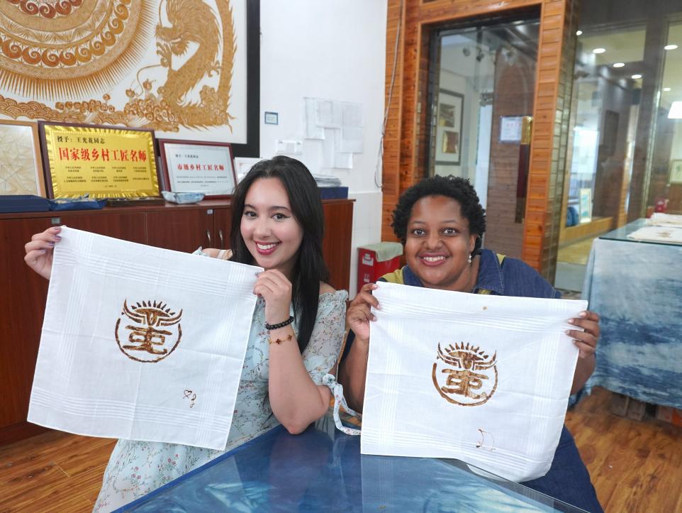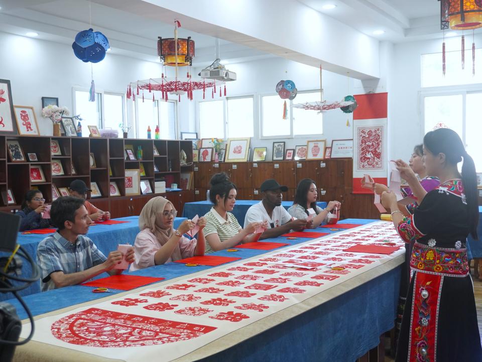 在彭水职教中心,外教及职工体验了中国非物质文化遗产——剪纸与蜡染技艺。在非遗传承人的悉心指导下,外国青年亲手完成剪纸图案和蜡染作品,不仅掌握了传统工艺基础,更加深了对中华文化细腻智慧与美学价值的理解。